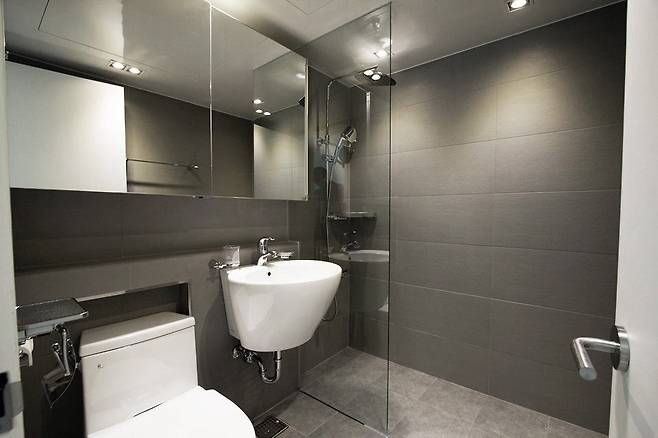 화장실은 벽면과 바닥 타일을 동일하게 그레이 계열의 타일로 시공했어요. 욕조는 철거하고 샤워부스를 만들었지요.