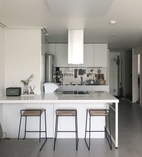 가장 중요한 포인트가 바로 식탁의 다리예요. 만약 저 부분이 싱크대처럼 측면부가 막힌 공간으로 마무리되었다면 이 공간이 정말 답답해 보였을 거에요.