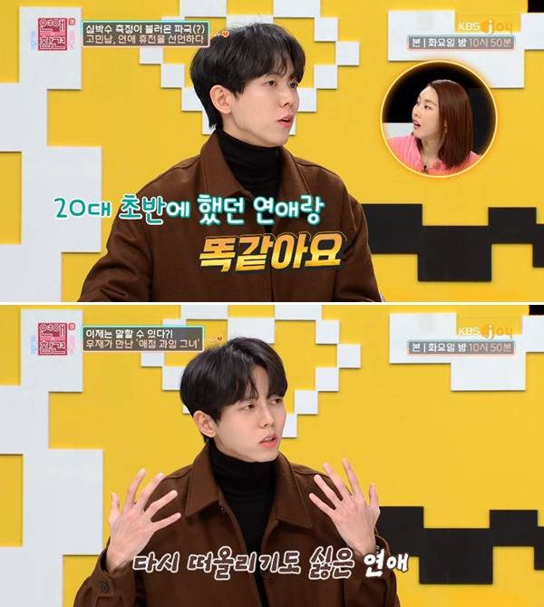 주우재의 연애 경험담에 한혜진은 "굉장히 예민한 사람이었나 보다"라고 말했고, 김숙은 "몇 년 견뎠냐"고 물었다. 주우재는 "그때는 20대 초반이다 보니 '연애는 이런 건가보다'했다. 2년 견뎠다"고 떠올렸다.