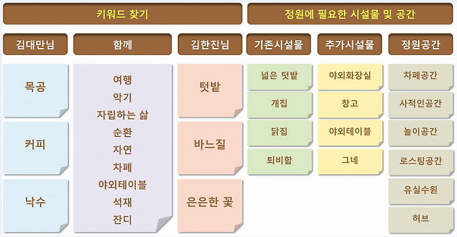 ‘공간 찾기’과정에서 이오는 아이디어 노트를 가지고 상담을 이어간다. 다섯 권의 책으로 만들 사진첩이다. 가족마다 각자 좋아하는 공간이나 정원의 모습을 메모지로 붙이면서 서로 생각을 공유한다. 집 꾸미기 아이디어, 요리, 영감을 주는 스타일 등 시도해 볼만한 아이디어를 찾는 사이트 핀터레스트(www.pinterest.co.kr)에서 찾아보면 서로 어떤 생활정원을 원하는지 재미나게 이야기를 나눌 수 있다. 이렇게 필요한 공간을 서로 이야기 나누면서 함께할 수 있는 공간과 특별한 공간을 정리한다.