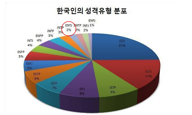 그런데 대한민국에서는 단 2% 내외만이 이 유형에 속한다고 합니다. 한국심리검사연구소에 따르면 전세계 인구 중 ENTP비율은 3.2% 수준이라고 합니다.