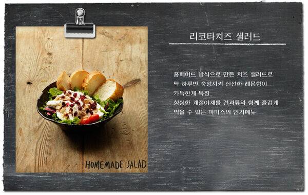 홈메이드 느낌의 샐러드와 각종 샌드위치를 골고루 맛볼 수 있는 프랜차이즈 카페다. 카페이지만 샌드위치와 샐러드를 주 메뉴로 하는 이곳에는 기본 닭가슴살 샐러드부터 뿌리채소 샐러드, 머쉬룸 샐러드 등이 있으며 허니까망베르치즈, 소고기가지, 모짤렐라토마토, 터키 등의 재료가 들어간 샌드위치 등 여러 가지가 있다. 파인애플, 적포도, 수박, 케일청포도, 망고 등 신선한 생과일주스의 종류도 꽤나 많다. 따뜻한 스프도 샌드위치와 샐러드와 함께 같이 즐기기 좋은 메뉴다.