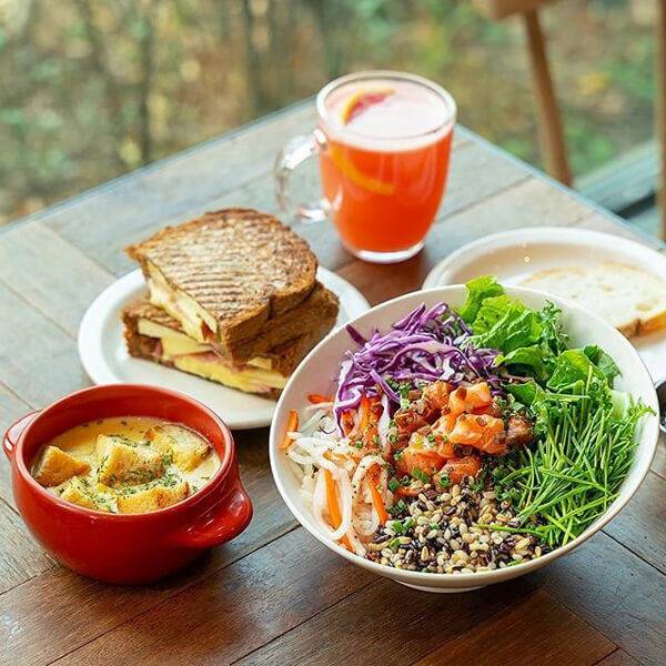 볼 샐러드와 플레이트 샐러드 두 가지 타입이 있으며 치킨과 연어, 훈제오리, 아보카도, 새우 등의 다양한 재료들이 들어간다. 구운 고기가 제공되는 플레이트 샐러드는 마늘빵이 기본으로 제공되며 스쿱 샐러드 토핑이 추가로 선택 가능하다. 샌드위치는 에그 마요, 아보카도 햄치즈가 있으며 함께 먹기 좋은 머쉬룸 스프와 콘 스프도 있다. 오전 10시 30분부터 오후 1시 사이에 방문하면 데일리 수프와 샌드위치, 아메리카노를 세트로 즐길 수 있는 브런치세트도 맛볼 수 있다.