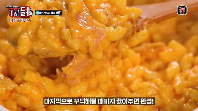 꾸덕해질 때까지 잘 끓여주면 꾸덕꾸덕한 불닭 맥앤치즈 완성이닭! 느끼한 맥앤치즈에 불닭의 매콤함이 더해져 계속 들어갈지도 모른닭ㅋㅋㅋ