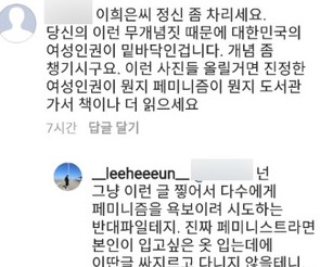 "이런 무개념 때문에 한국 여성인권 바닥" 이라는 악플을 받기도 했죠.