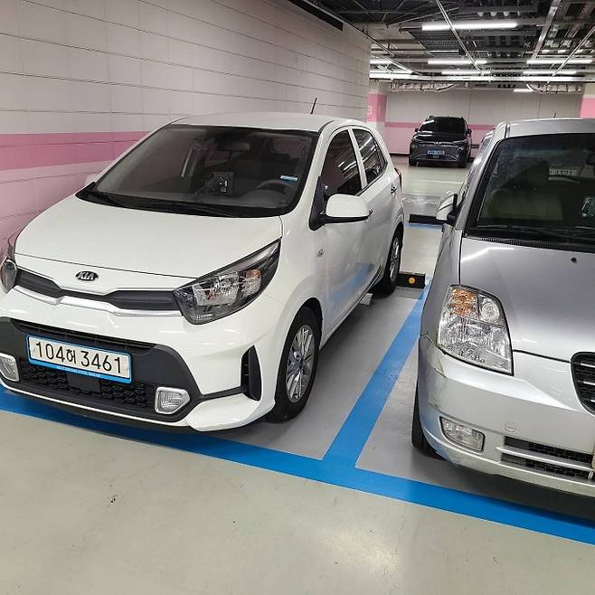 목적지에 도착하니 의외의 혜택이 기다리고 있다. 건물에 ‘경차 전용 주차장’이 있었다. 항상 지하 2층과 3층의 경차 주차장을 아쉬운 눈으로 쳐다보며 지하 5층까지 내려갔었는데 이날은 다르다. 의기양양 구형 모닝 옆에 차를 세웠다. 파란색 라인의 경차 전용 주차공간이다.