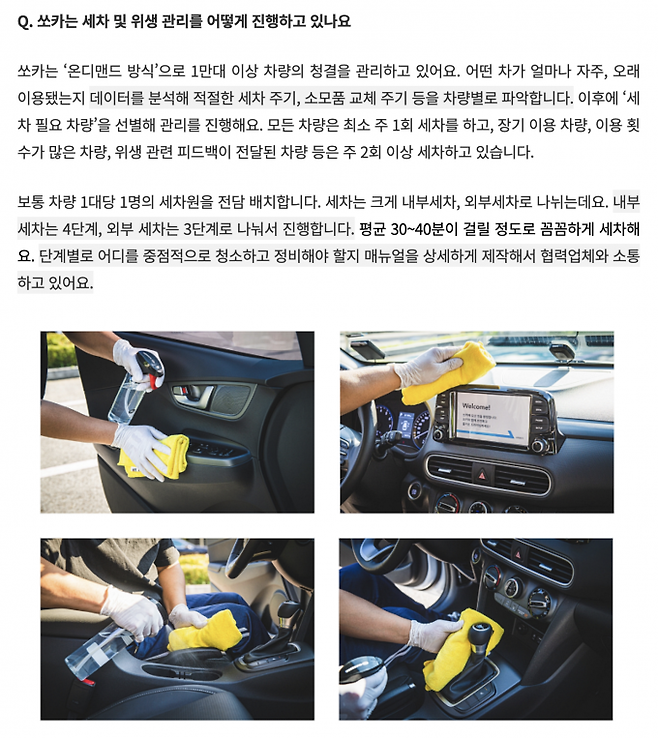 쏘카 공식 블로그에 따르면 ‘온디맨드 방식’으로 1만대 이상의 청결을 관리한다고 한다. 자주 쓰는 차는 자주 청소하고 최소 주 1회 세차를 한다. 그리고 위생 관련 피드백이 전달된 차량은 주 2회 이상 세차를 한다고 밝히고 있다. 또, 1대당 1명의 세차원을 전담 배치해 관리한다고도 말한다.