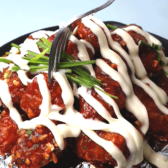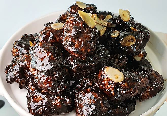 드디어 이 블.랙.닭.강.정 을 먹을 시간이 왔네요... 일단 냄새가 너무나 향기롭고 윤기가 좔좔이라 경계심이 조금 풀어지긴 했지만 최근에 밥심이 괴상한 음식 리뷰를 몇 번 하다 보니 조금 무섭긴 하네요 ㅎㅎ 소스는 오징어 먹물과 춘장이 들어간 소스라고 하던데 매끈하고 꾸덕한 질감이었어요. 농도가 엄청나게 진하네요.