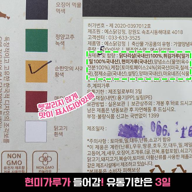 부위는 100% 닭 다리 살이고 튀김 재료에 현미가루가 들어있네요! 현미를 넣으면 더 바삭한가요? 왠지 그럴 것 같은 느낌... 정말 갓 만들어 식혀 배송하는 닭강정이라 그런지 유통기한은 만든 날부터 3일이니 가급적 빨리 드시는 게 좋을듯해요!