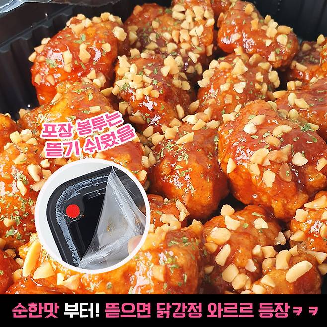 이제 본격적으로 시식을 해볼게요. 만만한 순한 맛부터 시작해보겠습니다:) 가끔 닭강정 집에서 '안 매운맛'이라고 해도 조금의 매콤함이 있는 경우도 꽤 있는데요, 이건 매운맛이 아예 없는 달달한 맛이에요!