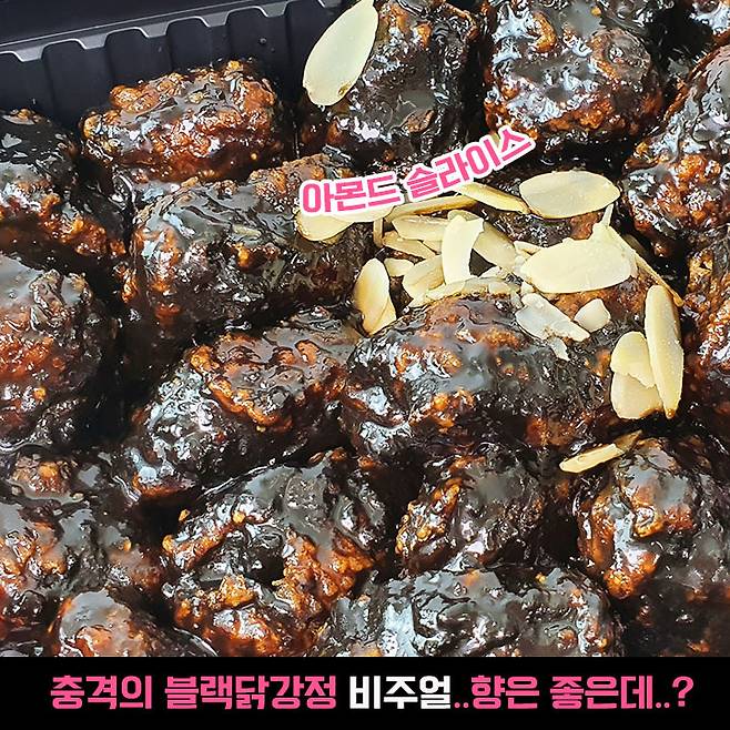 블랙 닭강정 위에 뿌려진 게 마늘 후레이크 인줄 알았는데 아몬드였어요... 블랙 닭강정 맛이 워낙 순하다 보니 마늘후레이크를 토핑으로 올려주셔도 맛있을듯해요.