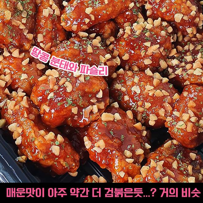 매운맛과 순한 맛 모두 빨간 양념이라 언뜻 봐선 구분이 어려웠는데요, 찬찬~히 보면 매운맛이 아주아주 약간 더 검붉은 색을 띠는 것 같기도 해요. 이건 개인차가 있을 수 있습니다ㅋㅋ밥심의 기분 탓일 수도... 토핑으로 땅콩분태와 파슬리가 솔솔 뿌려져있네요.