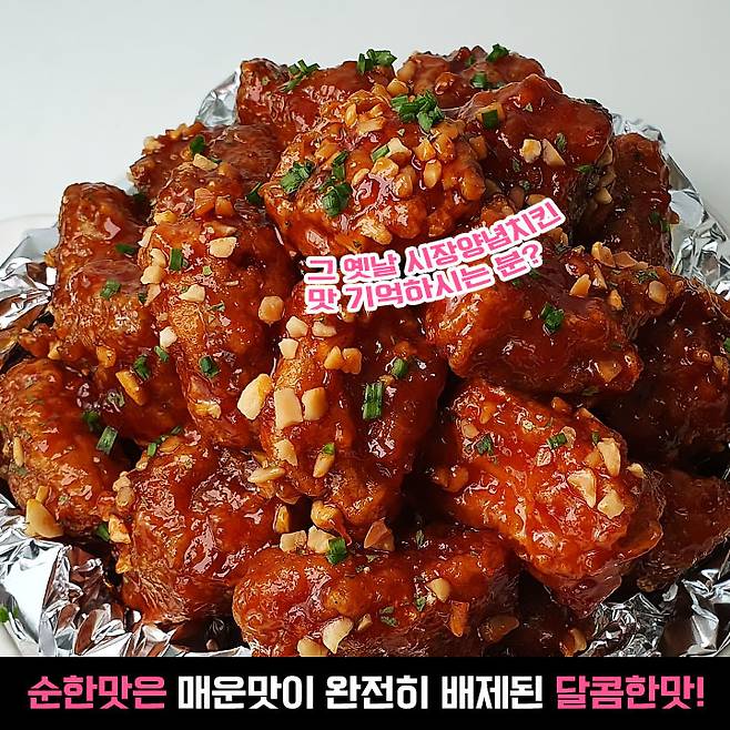 혹시 얇은 종이박스에 은박지 깔고 치킨 넘치게 눌러 담아 뚜껑을 고무줄로 겨우 닫아주던 시장표 양념치킨 생각나시나요? 요즘엔 거의 찾아보기 힘든 맛인데... 딱 그 맛이었어요! 시장표 치킨 그리우신 분들 순한 맛 꼭 시도해보세요!