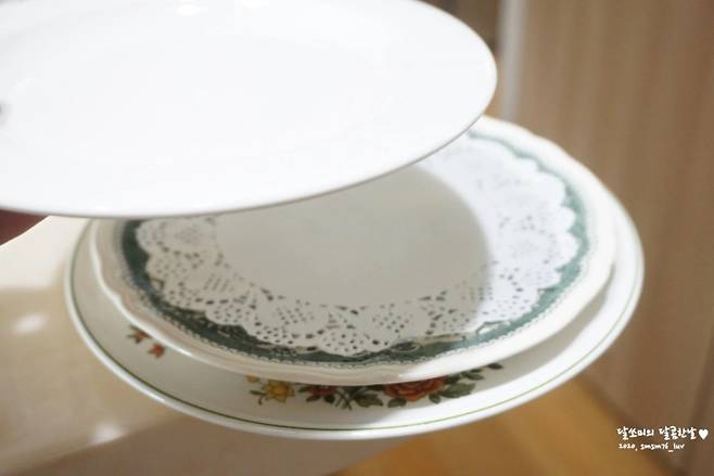 겹쳐둔 접시에 스크래치라도 생길까 고심하다가 도일리 페이퍼를 사용해봤는데.... 브라보!! 효과가 아주 좋더라고요.