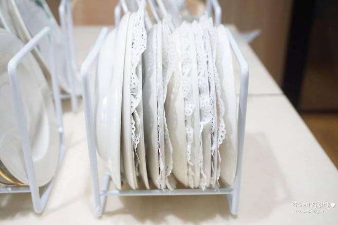 중간에 있는 접시를 꺼낼 때에도 도일리 페이퍼를 함께 잡고 꺼내면 그릇이 서로 부딪히는 일을 줄일 수 있어요. 깔끔하죠?
