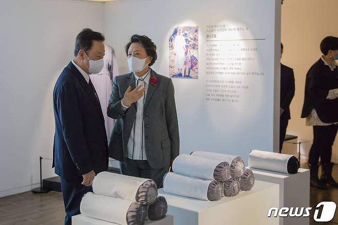 (서울=뉴스1) 박정환 문화전문기자 = 박용만 두산인프라코어 회장이 아내 강신애 여사에게 29일 서울 중구 명동 디아트플랜드 요갤러리에서 열린 '수녀복, 기도와 치유가 되다'전시에 대해 설명하고 있다. 4월13일까지 이어지는 이번 전시는 20년 이상 낡은 수녀복 20벌을 기도방석과 베개로 재활용했으며 박 회장이 직접 기획했다. 2021.3.29/뉴스1