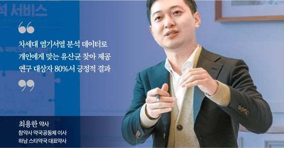 최 약사 쎌바이옴 프로젝트에 약국 서른 군데가 참여했다. 30명을 설사, 변비, 과민성 대장증후군 등 세 그룹으로 나누고 사전 설문조사의 증상과 NGS 검사 결과로 본 미생물 상태가 어느 정도 일치한 것을 확인했다. 맞춤형 유산균을 선별해 제공한 뒤 2차 검사를 진행하고 있다. 그 결과가 20% 정도 공개됐는데, 참가자의 80% 이상에서 ‘장 건강이 좋아졌다’는 긍정적인 결과를 얻었다. 기존의 단순한 설문 방식이 아닌 객관적인 마이크로바이옴 분석을 거친 진짜 맞춤형 건강기능식품의 표본이라고 생각한다.