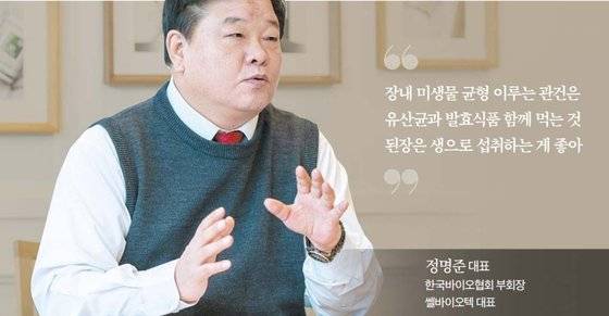 정명준 대표(이하 정 대표) 그렇다. 그 전에 유산균에 대한 오해부터 풀어야 한다. 한국의 많은 소비자가 ‘유산균을 먹으면 설사, 변비, 아토피 피부염, 치매, 과민성 대장증후군 등을 치료할 수 있다’고 여긴다. 하지만 이는 틀린 얘기다. 유산균이 이들 증상·질환을 치료하는 게 아니라 ‘유산균이 몸속 마이크로바이옴을 정상적으로 만드는 트리거(기폭제) 역할을 한다’는 게 정확한 표현이다. 섭취한 유산균은 몸속에서 유기산 같은 산 성분을 내보내는데, 이것이 마이크로바이옴의 체질을 바꿔준다. 쉽게 말해 유산균이 마이크로바이옴의 정상화에 기여한다는 것이다. 그런데 마이크로바이옴은 사람마다 구성 성분과 변화 패턴이 다르다. 사람마다 필요로 하는 유산균이 다른 것도 이 때문이다. ‘마이크로바이옴’은 장내 미생물 무리를 뜻한다. 마이크로바이옴에는 5000~7000종의 유익균이 들어 있고, 이들 유익균의 수는 100조 마리에 달한다. 최근 세계 의학계에선 마이크로바이옴이 사람의 수명뿐 아니라 미래에 발생할 수 있는 질병을 좌우할 수 있다는 점에서 주목받는다.