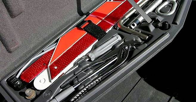 단순히 짐을 보관하는 차량 트렁크 내부를 잘 살펴보면, 차량마다 비상 공구함이 비치되어 있습니다. 이 안에는 볼트를 풀고 조일 수 있는 스패너, 휠 볼트를 다루는 L형 휠스패너 차를 띄울 수 있는 리프트 잭, 드라이버, 견인고리 등의 공구들이 있습니다.