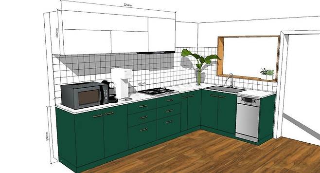 대신 도장 도어를 하기로 하고 원하는 디자인과 색감을 스케치업으로 그려 싱크대 업체에 가지고 갔어요.