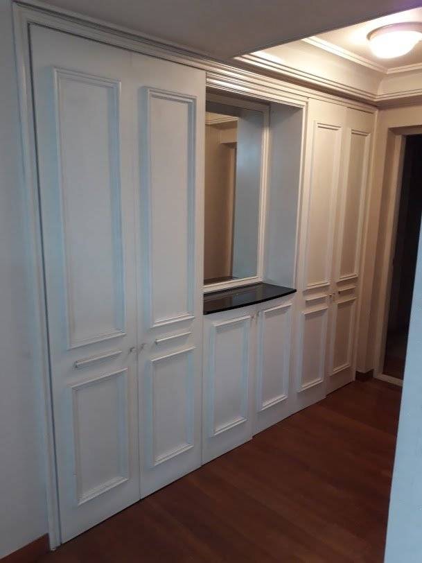 공간감을 주고자 벽과 붙박이장과 중문과 천장의 색은 똑같은 흰색으로 통일시켰습니다. 붙박이장은 원래 있던 그대로 쓰면서 필름 시공만 한 것인데 새것처럼 보여 매우 만족스럽습니다.