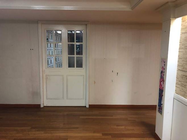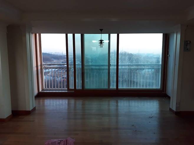 거실 마루는 창가를 따라 훼손이 심했습니다. 샷시 유리엔 습기가 차 있었고요.