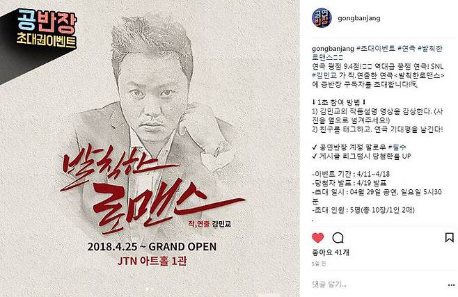 현재 공연반장 인스타그램에서, 연극<발칙한 로맨스> 초대이벤트 진행중이예요! 간단하게 이벤트 참여하고, 김민교가 연출한 꿀잼연극<발칙한 로맨스> 보러가세요!