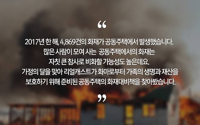 공동주택에서 발생한 화재는 대형참사로 이어질 가능성이 높습니다. 때문에 화재 피해에 대비한 설비들도 반드시 준비되어 있습니다. 재난안전대책본부가 제공하는 화재 시 행동요령을 숙지하는 한편, 내가 사는 아파트에 준비된 화재 대비책들을 미리 확인해 두는 것이 좋습니다.