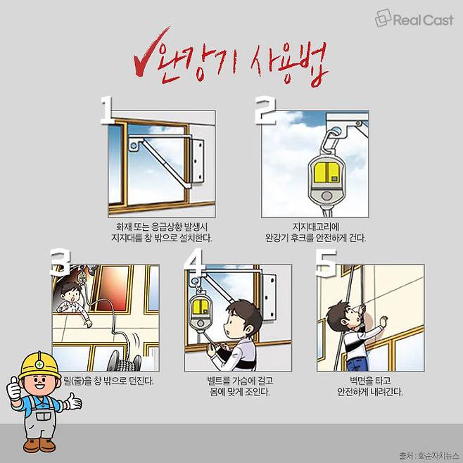 간신히 복도로는 나왔지만 외부 계단이 화염에 휩싸여 아래로 내려갈 수 없을 경우, 완강기를 이용할 수도 있습니다.