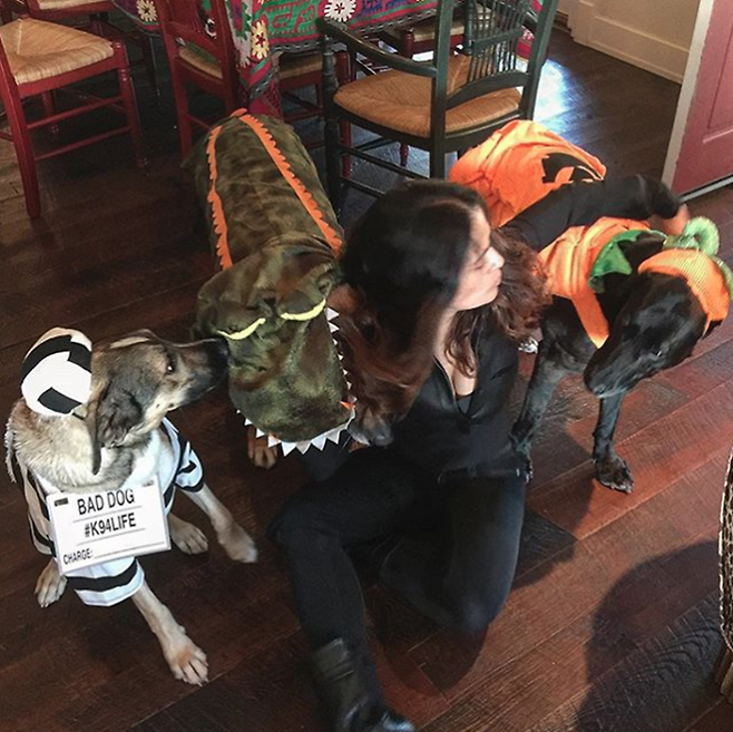 영화 '프리다'에서 프리다 칼로 역을 맡은 배우 셀마 헤이엑입니다. 그녀는 할로윈 때 인스타그램에 죄수, 악어 그리고 호박의 복장을 한 강아지들을 올렸습니다.