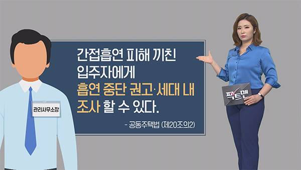 2018년부턴 아파트 관리 주체, 즉 관리사무소에서 입주자에게 흡연 중단을 권고할 수 있고, 세대 조사도 할 수 있다 규정은 있는데요.