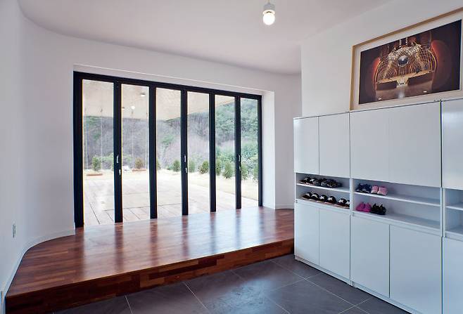 “건축주의 자녀가 이란성 쌍둥이이에요. 그 모습을 외관에 담았습니다. 전면에서 보면 왼쪽은 발코니를 설치해 살짝 들어가 보이고, 오른쪽은 확장해 발코니가 없습니다. 1층 매스의 길이도 달라 대칭과 비대칭이 교묘하게 섞이도록 디자인했어요. 외부에서 볼 땐 독특한 구조로 시선을 끌고, 안에 들어서면 곡선이 어우러진 내부가 따뜻하게 맞이합니다.”