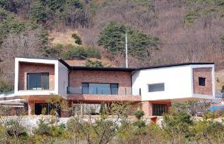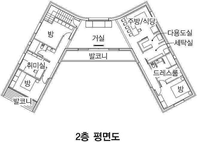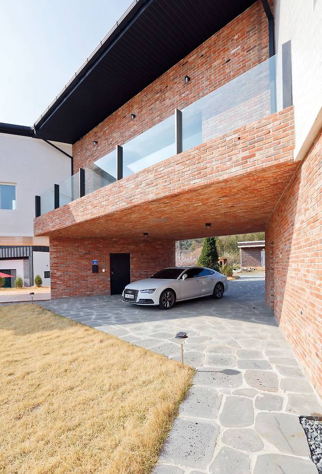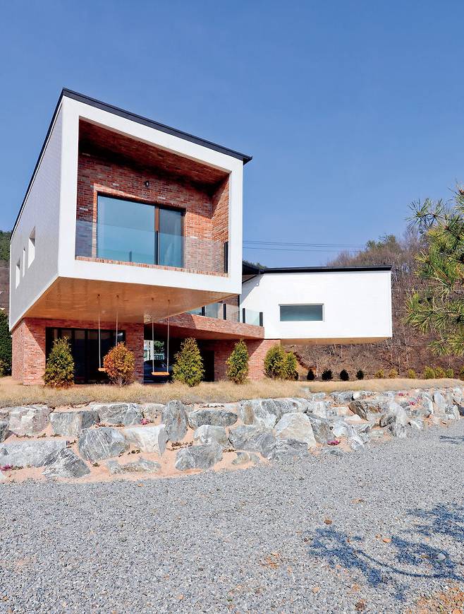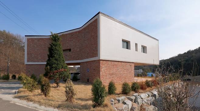 대지의 북쪽에 주택을 올려 남쪽에 마당을 뒀고, 마당을 최대한 넓게 사용하고자 생활공간을 모두 2층으로 올렸다. 북쪽으로 진입해 1층 주차장을 중심으로 기둥을 세우듯 좌우로 분리했다. 좌측은 현관과 2층으로 올라가는 계단을 뒀고, 우측은 게스트룸 겸 바비큐장을 배치해 생활공간과 구분했다. 기둥 같은 1층 위에 대지 모양에 따라 남쪽으로 벌어지는 ‘凹’자 모양의 매스를 올렸다. 여기에 건축가는 지형을 바탕으로 주택에서 흔치 않은 캔틸레버 구조를 사용했다.