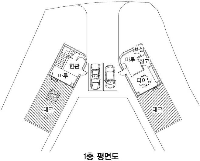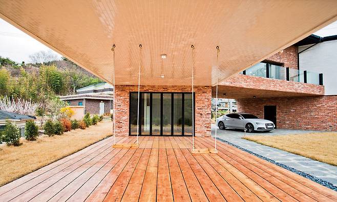 “2개로 분리된 형태의 1층 공간은 2층을 떠받치는 축의 역할을 합니다. 전면에서 보면 9m와 7m가 기둥 없이 떠 있는 캔틸레버 구조죠. 이를 통해 천장이 있는 공간들이 생겨났어요. 주차장은 출입구가 있는 중앙에 배치해 접근성을 살리고 나머지 2곳은 데크를 깔았습니다. 오른쪽 데크는 사람들이 앉아서 쉴 수 있는 정자 역할을, 왼쪽 데크는 아이들의 놀이터 역할을 부여했어요. 게다가 기둥이 없는 캔틸레버 구조를 사용해 마당이 더욱더 넓어 보입니다. 주변 이웃 주택 시야도 가리지 않아 마찰도 적었습니다.”