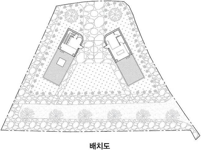 쌍둥이 주택의 대지는 약 400평으로 야트막한 야산 사이 중간에 폭 안긴 북고남저형 사다리꼴 모양이다. 좌측은 이웃 필지에 면하고 전면은 과수원, 우측과 북측은 도로와 접한다. 대지를 2단으로 나눠 1.5m 차이를 두고, 그 아래 과수원과 2.5m 레벨차가 있어 향후 앞에 주택이 들어서더라도 시야를 가리지 않는다. 아래 마당 터는 3m 폭의 단을 주어 텃밭이나 캠핑장을 꾸릴 수도 있고, 외부 수돗가 설비로 세차도 할 수 있는 공간을 확보했다.