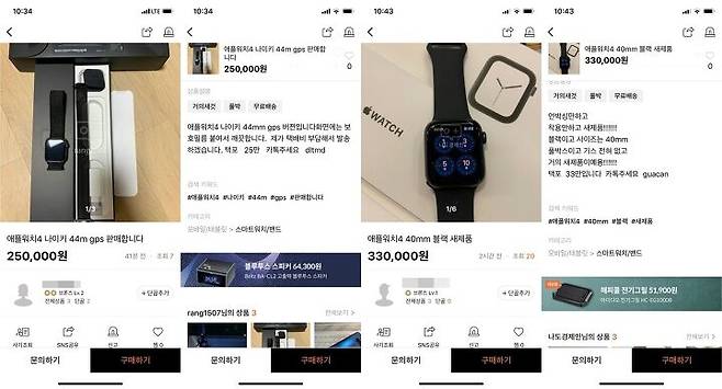 사기꾼 감별법을 익힌 제가 모니터해본 결과 중고나라 앱에 올라오는 애플워치4 중고 매물 중에 열에 여덟~아홉은 사기꾼들이 올린 허위 매물입니다. 휴대전화 번호를 공개하거나 직거래나 중고나라 안전거래를 제안했을 때 거래를 하겠다고 하는 경우는 열에 한둘이 전부입니다.