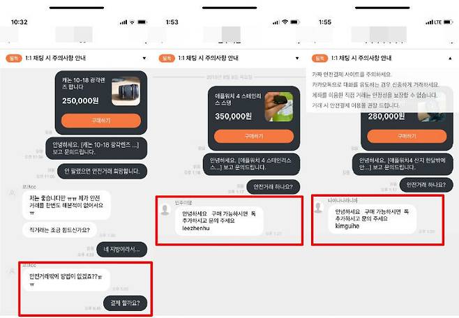 처음엔 가장 저렴한 제품을 올려놓은 판매자에게 연락을 해봤습니다. 그런데 저렴한 가격대의 제품을 올려놓은 판매자들은 대부분 게시판에 문의해도 답이 없고, 채팅을 시도해 “안전거래를 희망한다”고 메시지를 보내면 카톡 아이디를 알려주면서 카톡으로 연락하라고 하더군요.