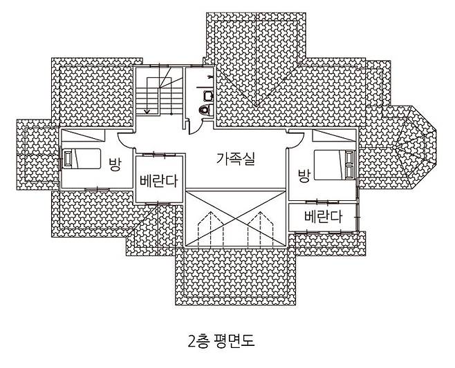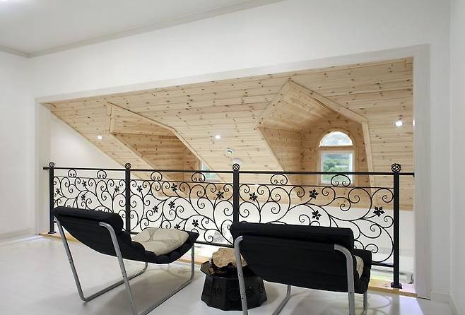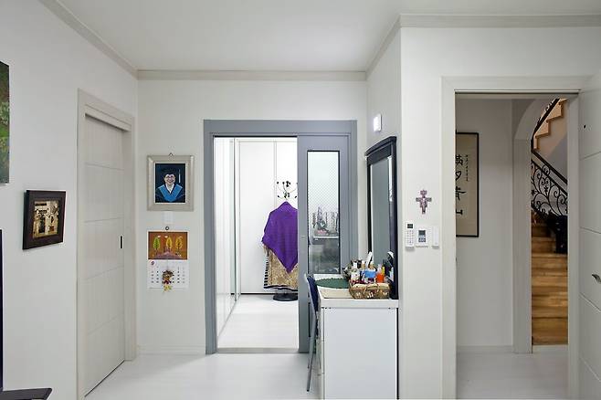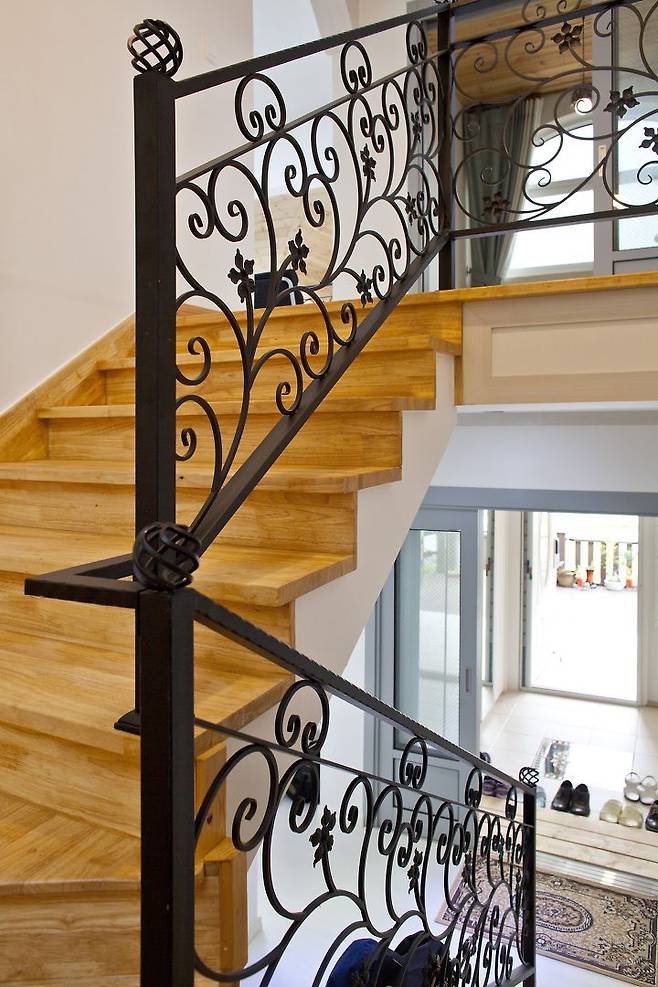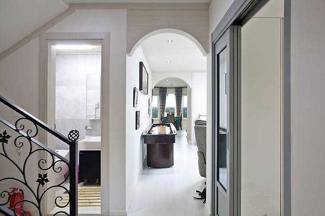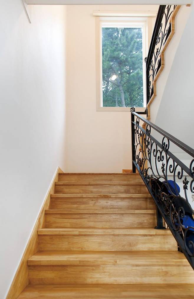소나무와 대나무가 어우러진 뒷산을 마치 한 폭의 동양화 족자를 건듯 장방형 창에 담아낸 계단실엔 별도의 장식이 필요가 없다. 2층엔 각각의 공간에서 접근도가 높은 계단실 우측에 욕실이 있으며, 계단실 전면으로 현관 위에 설치한 베란다와 마주한다. 베란다는 서너 명이 한 팀을 이뤄 담소를 나눌 만큼 제법 널찍한 규모인 데다 반원 창으로 내다보이는 뷰도 빼어나다. 가족실 좌우엔 2개의 방이 있는데 좌측의 방은 애초 게스트룸을 계획했으나, 현재 드레스룸으로 사용하고 있다. 그리고 가깝게는 감나무밭이, 멀게는 주남저수지가 바라보이는 베란다가 있는 우측의 방이 전 교수의 공간이다.