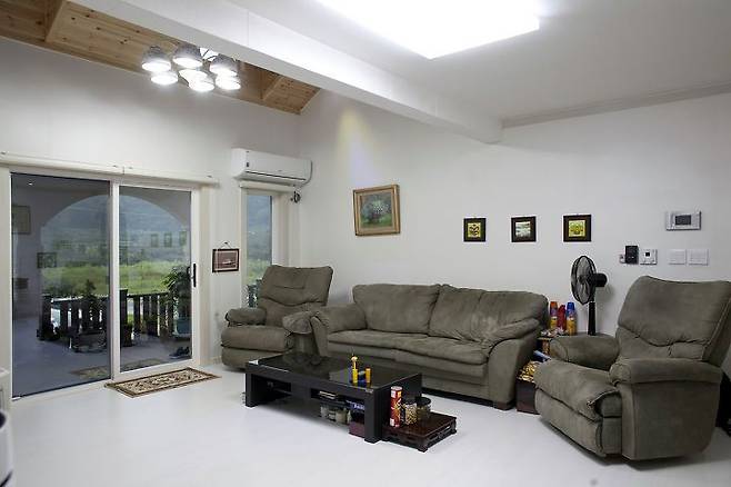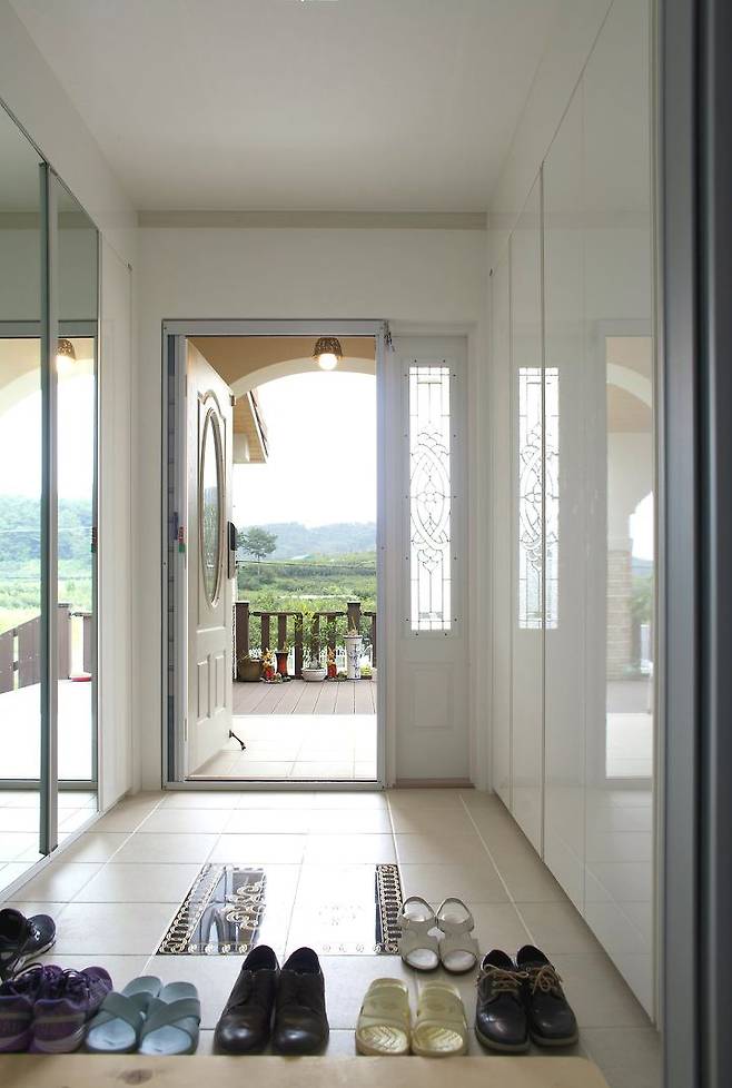2층 가족실과 호응하는 오픈 구조의 거실 전면에 볕을 가리고 눈비를 막기 위한 포치가 있음에도 거실 분위기가 명랑하다. 2개의 지붕 창으로 자연광을 집 안 깊숙이 끌어들였기 때문이다. 거실은 목제 루버 천장을 제외한 벽과 바닥을 화이트 톤으로 디자인해 넓고 깔끔해 보인다.
