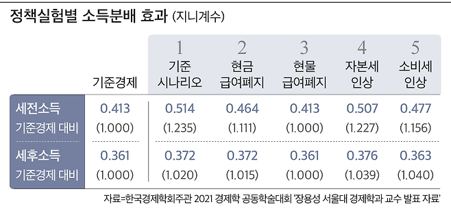 장 교수는 "기본소득을 지급할 경우 지니계수가 오히려 악화되는 것으로 나타났다"며 "예비적 동기의 노동감소가 고용률 하락으로 이어지면서 근로소득이 없는 계층이 크게 증가했다"고 설명했다.