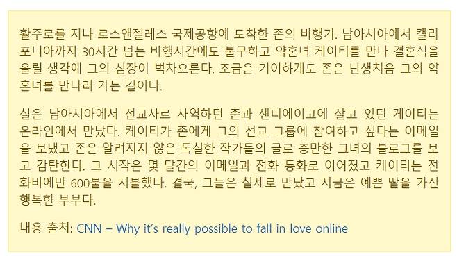 이 오묘하고 가상 아닌 가상 공간의 사랑 이야기가 한국 SNS 곳곳에서도 적지 않게 들려온다. 34세 장훈(가명) 씨는 인터넷 사진 동호회로 알게 된 여자 친구의 블로그의 쪽지로 연락했다. 전 여자 친구도 페이스북을 통해 사진 영화 등 관심사를 공유하며 만났다고 한다.