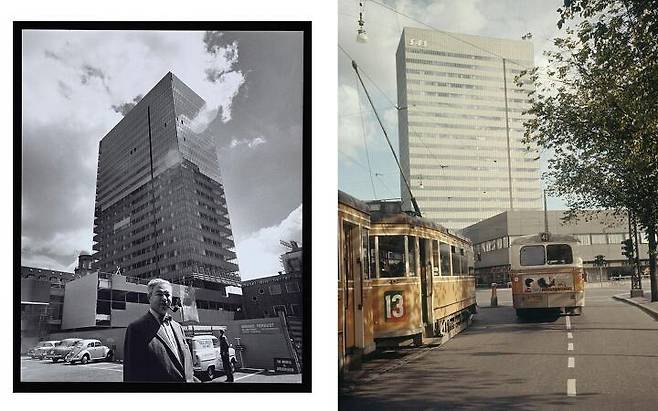 [공사 중인 SAS 로열 호텔 앞에서 사진을 찍은 아르네 야콥센과 SAS 로열 호텔 전경 © Danmarks Kunstbibliotek]