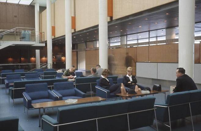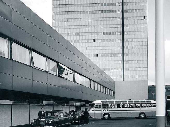풍요로움에 젖은 미국인 관광객이 유럽으로 밀려들자 스칸디나비아항공(SAS)은 유럽 최초의 시내 공항 터미널을 코펜하겐에 구축하기로 계획하면서 덴마크 최초의 초고층 건물인 20층짜리 ‘SAS 로열 호텔’까지 묶은 ‘SAS 하우스 프로젝트’를 야콥센에게 의뢰하게 돼. 그는 ‘모던 가든’이란 테마 아래 호텔 외면을 알루미늄과 녹색, 녹회색 유리창으로 가득 채워 코펜하겐의 도심과 하늘이란 외부 풍경을 건물에 담았어.