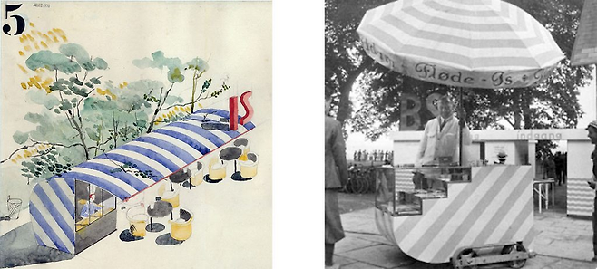 재능왕 야콥센은 1931년부터 1936년까지 벨레부에와 관련한 세 가지 프로젝트를 진행했는데, 첫 번째로 벨레부에 해변을 디자인했어. 해변을 디자인하는 게 뭐냐고 물을 텐데, 말 그대로 해변 이용객들을 위한 여러 시설과 자잘한 것들을 자기 혼자서 몽땅 만들었어. 지금은 해변의 상징이 된 파란색 스트라이프의 구조대 타워를 비롯해 매점, 탈의실, 텐트부터 티켓, 시즌권, 직원 유니폼까지 말이야. 두 번째로는 벨레부에 해변가에 건립한 벨라비스타 주택 단지를, 마지막으로 벨레부에 극장과 레스토랑을 만들며 대망의 막을 내렸어. 특히 벨라비스타 주택 단지는 매끄럽고 눈처럼 희게 처리한 건물 표면에 태양이 만드는 그림자가 시간에 따라 끊임없이 변화하며 생기를 주었고, 매우 단순하고 기능적인 디자인 덕분에 이국적이면서 우아한 현대성을 품었다는 찬사를 받으며 당대 덴마크에 나타난 모더니즘 건축의 대표작으로 꼽힐 정도였어.