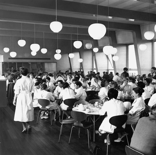 [야콥센의 그 유명한 ‘앤트 체어’도 덴마크의 제약회사 노보노르디스크 사옥을 만들면서 사원용 구내식당을 위한 의자로 기획했다는 사실! 그래서 싸고, 튼튼하고, 쌓을 수 있고, 옮기기 편하게 만들었어. © Wikimedia]