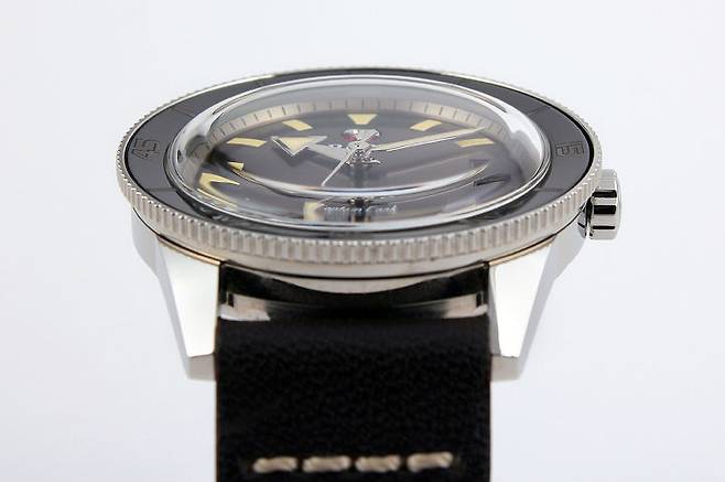 복각 모델의 케이스 사이즈는 직경 37mm입니다. 소재는 스테인리스 스틸. 최근의 복각 모델들을 보면 디자인은 옛 것을 따르지만 사이즈는 현대적인 트랜드에 맞춰 대부분 40mm 이상으로 오리지날 모델보다 크게 키우는 것이 일반적입니다. 이에 반해 캡틴 쿡 복각 버전은 오리지날 모델의 사이즈를 그대로 이어 복각의 진정성에 더 가까이 다가갈 수 있었습니다. 현재의 관점에서 보면 남성 시계로37mm 사이즈는 작지만 (캡틴 쿡 여성 모델 역시 37mm 입니다), 60년대만 하더라도 남성 시계로서 37mm는 결코 작은 시계가 아니었습니다. 이는 45mm 오버사이즈 크기로 출시한 모던 버전을 출시함으로써 복각 버전이 오히려 더 복각에 충실할 수 있도록 한 모습입니다.