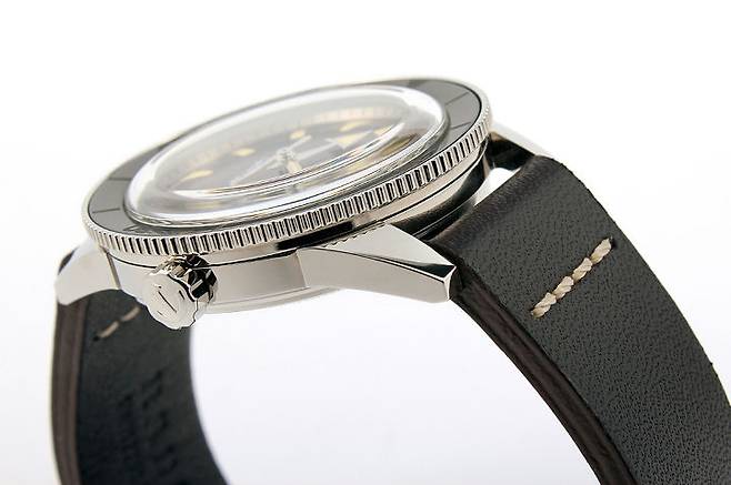 작은 사이즈와 더불어 빼놓을 수 없는 이 시계의 장점은 현행 스포츠 시계에서 찾아볼 수 없는 독특한 스타일에 있습니다. 안쪽으로 경사진 베젤, 플랙시 글래스를 연상시키는 돔형 글래스, 오버사이즈 인덱스, 두툼한 화살형 핸즈, 터프한 가죽 스트랩은 개성을 추구하는 현대인의 정서를 자극합니다.