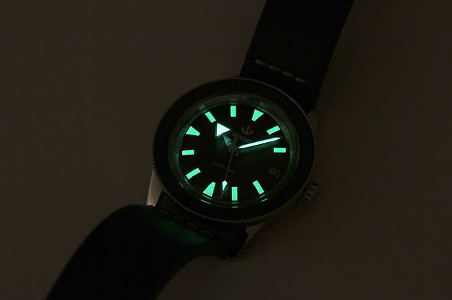 오버사이즈 인덱스, 두툼한 화살형 핸즈 디자인을 그대로 살려 복각 시계로서 정체성을 잘 표현하고 있는 가운데 야광 도료 역시 빈티지 컬러로 처리해 완벽함에 가까워졌습니다. 다만 야광성능은 핸즈에 비해 인덱스 부분이 약간 떨어지는 것을 확인할 수 있었습니다.