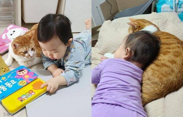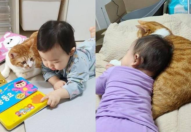 [노트펫] 아기 집사가 옆으로 다가와 옹알이를 하자 치즈 냥이는 옆에 딱 붙어 한 마디도 놓치지 않고 들어줬다.