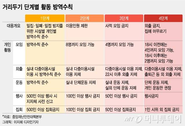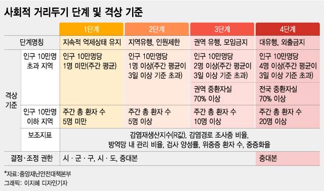 거리두기 단계는 △억제(1단계) △지역유행/인원제한(2단계) △권역유행/모임금지(3단계) △대유행/외출금지(4단계)로 구분한다.